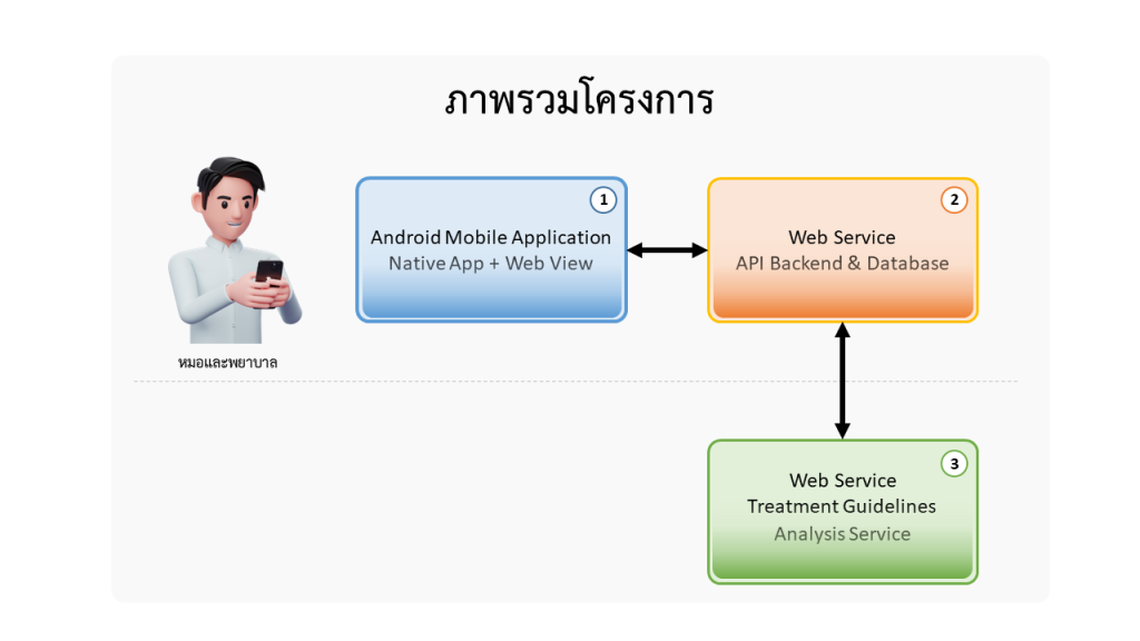 ส่วนงานที่ 1 Android Mobile Application ได้ถูกพัฒนาโดยใช้เครื่องมือ Angular JS ซึ่งถูกใช้งานสำหรับส่วนการแสดงผลในหน้า UI ที่ถูกใช้งานโดยหมอและพยาบาล เพื่อทำการบันทึกข้อมูลผู้ป่วยและการวิเคราะห์วางแผนการรักษาโดยใช้ปัญญาประดิษฐ์